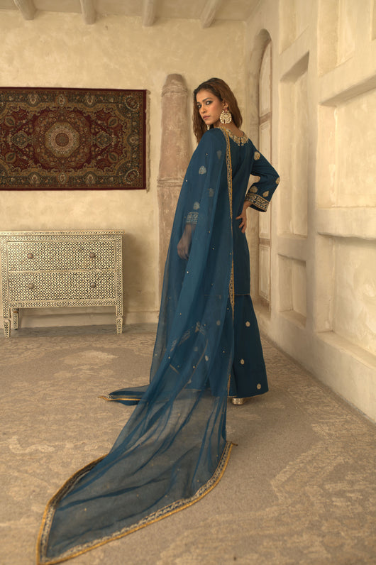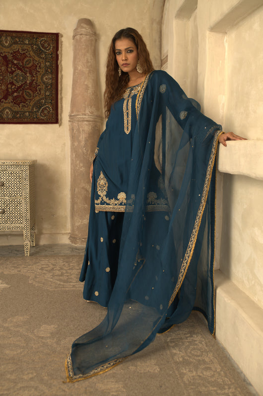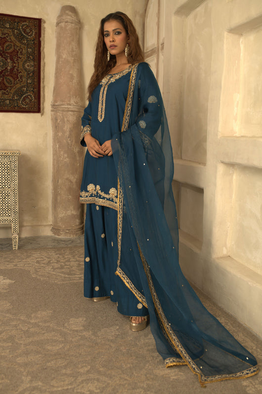 BLUE MUGHAL JAAL BEL SHARARA SET