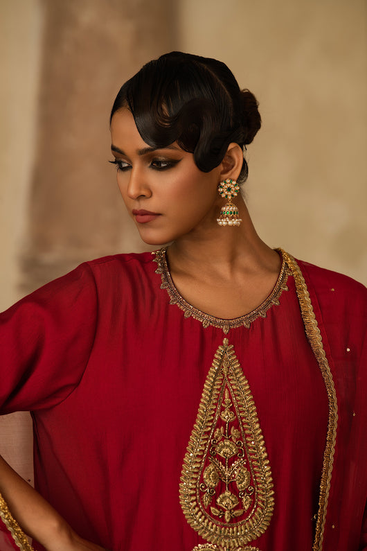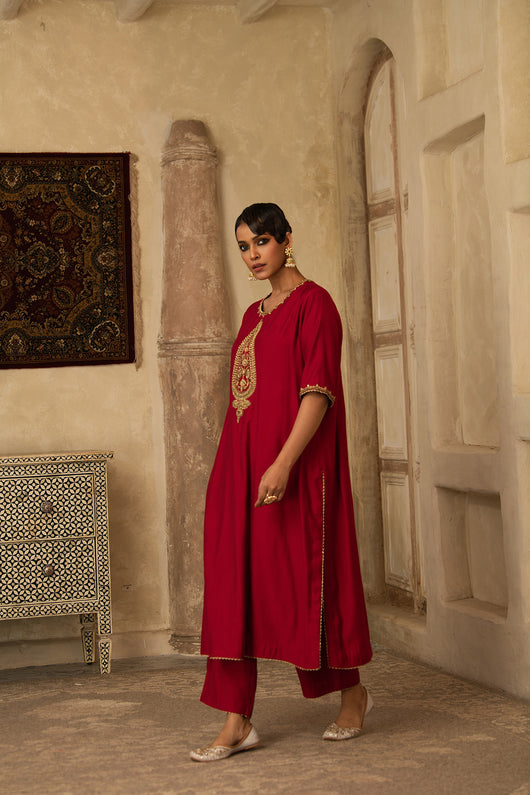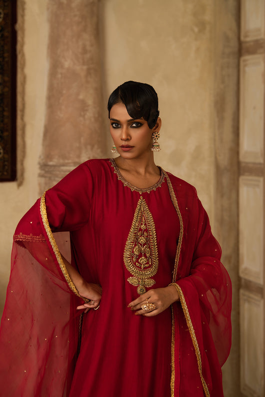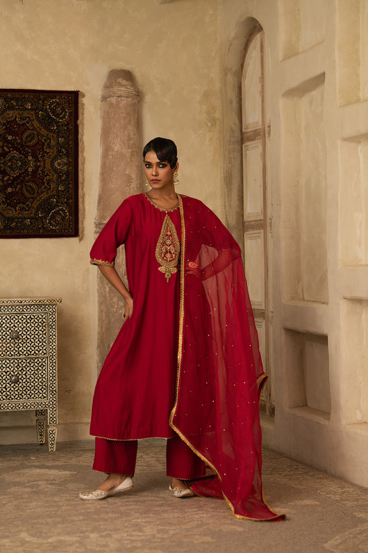 A minimal straight kurti in slub fabric with subtle sleeve embroidery, paired with a rich dupatta - a perfect balance of simplicity and festivity.