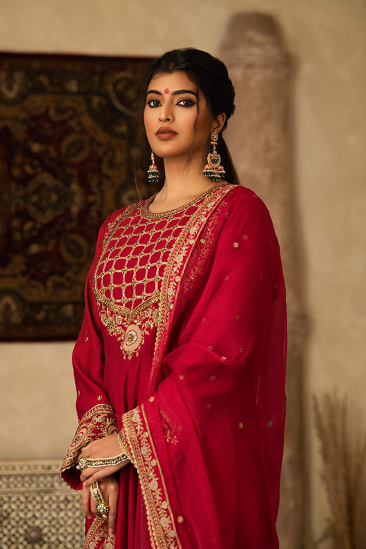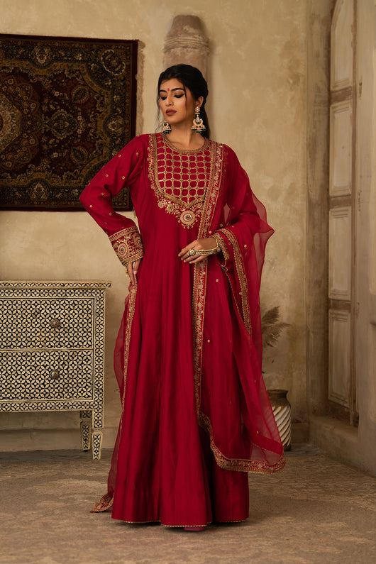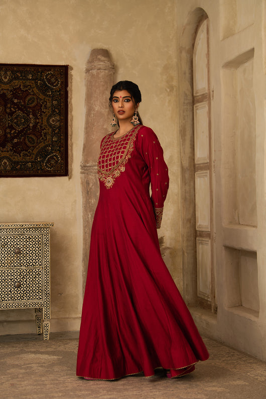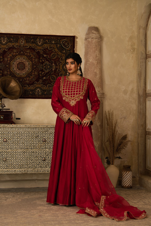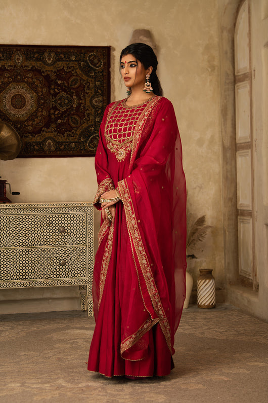 Elegant anarkali set tailored in slub fabric, highlighted with heavy and intricate jaal like embroidery focusing on the bodice , enhanced by delicate handwork - perfect for festive elegance.