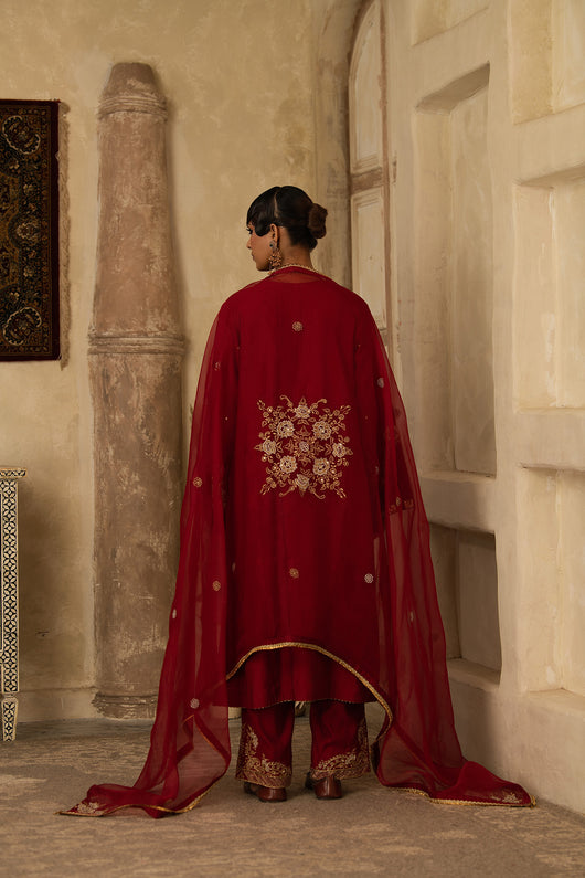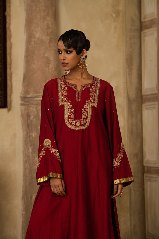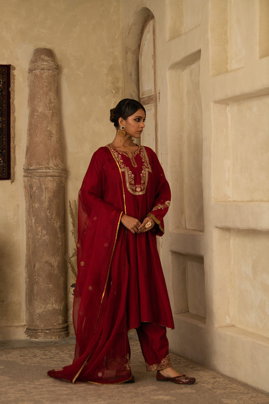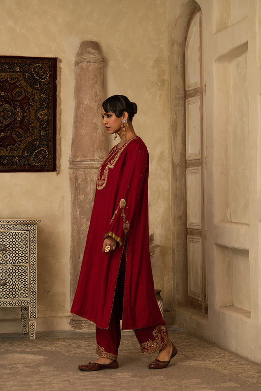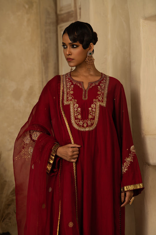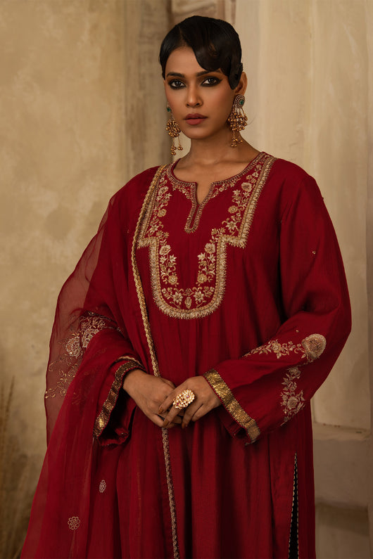 Tailored in rich fabric, this festive ensemble celebrates artistry and heritage. The highlight is its graceful jharokha neckline, a design that frames the silhouette with regal charm. Intricate machine embroidery flows seamlessly across the fabric, enhanced by delicate handwork that adds depth, texture, and a touch of craftsmanship. Blending elegance with tradition, this piece is perfect for festive occasions-where timeless detailing meets contemporary sophistication.