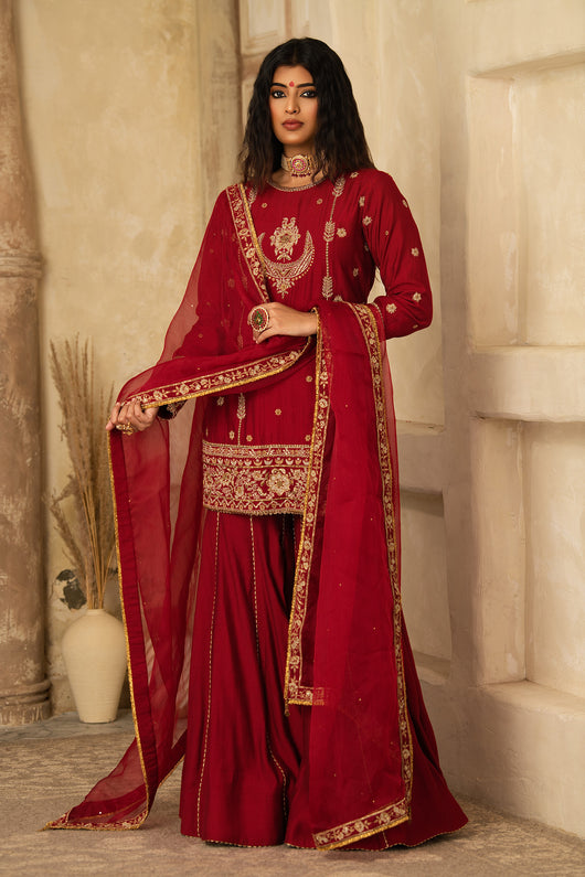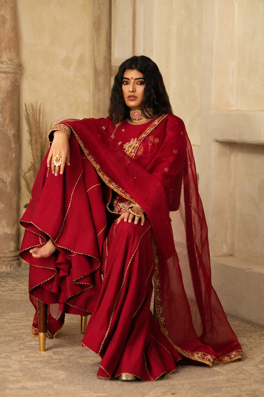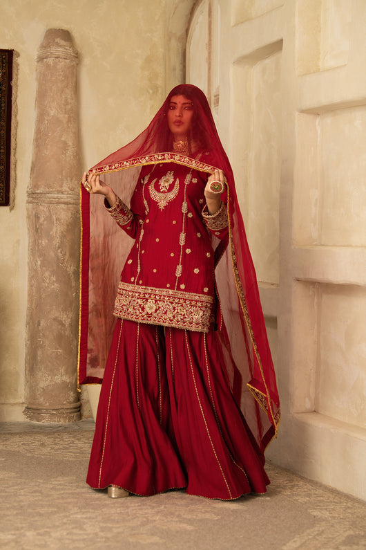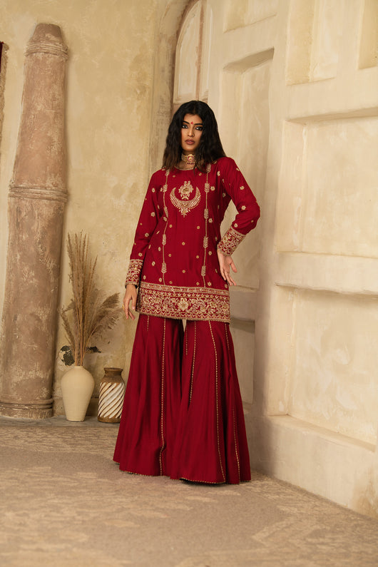 Step into celebrations with this beautifully crafted garara set, designed to blend traditional artistry with contemporary elegance. The ensemble is highlighted with heavy, intricate embroidery, meticulously placed to create a rich, luxurious visual appeal. Enhanced with delicate handwork, each detail reflects exceptional craftsmanship, adding depth and sophistication to the design. The garara’s flowing silhouette offers comfort while maintaining a graceful, flattering fit, making this set perfect for weddings, festive gatherings, or any special occasion where elegance meets celebration.